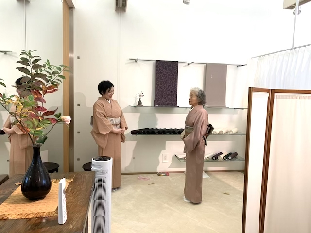 さて、今日は國さんが「展示会期間中なのに、思わず受けてしまった(笑)!」と言っていた、「着付け一日コース」のお稽古日でした。奥では私が着付けをお伝えし、カーテンの向こうでは國さんとおかみさんが接客という、活気に満ちた一日。そして今は、お仕事を終えてからご来店予定のお客様をお待ちしているところです。ありがたいことに、たくさんのご来店に恵まれています^^