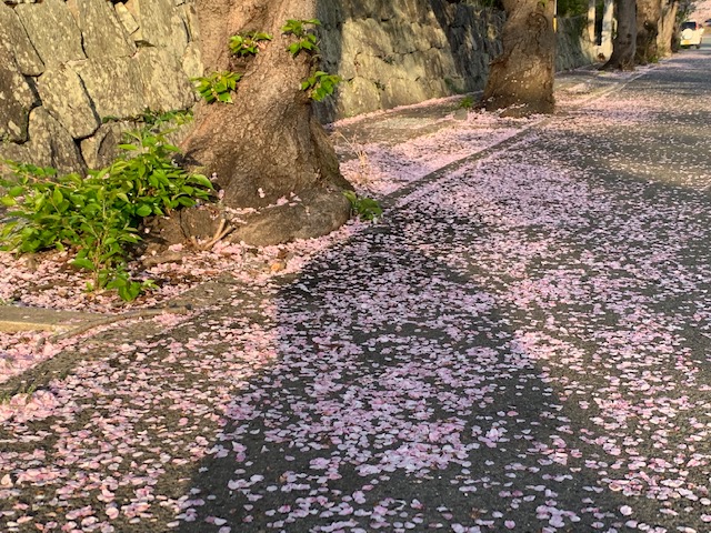 地面には、ピンクに染まった桜のじゅうたんができていました。