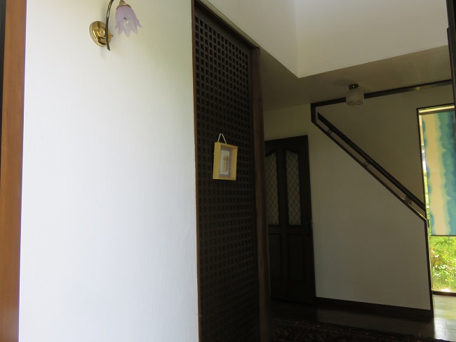 写真は、前回の「熊本ゆかりの染織作家展第5回」に出品された吉田さんのタブロー作品「Pink Crossing」を飾ったNさま邸の玄関口です。