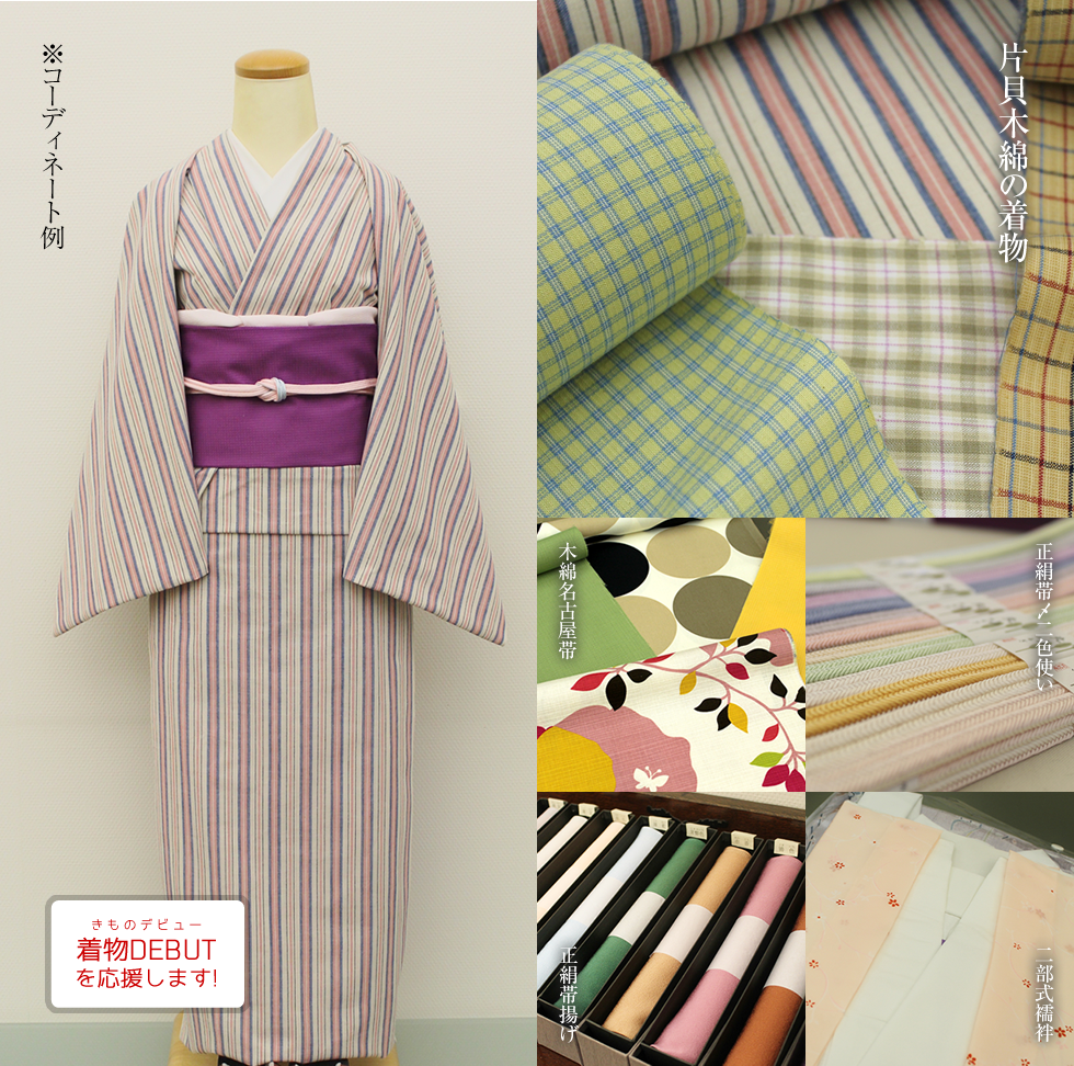 | 片貝木綿の着物(綿100%) | ¥43,800-(税別) | 優しい肌触りで着心地抜群。完全オーダーのマイ寸法仕立てです。 |