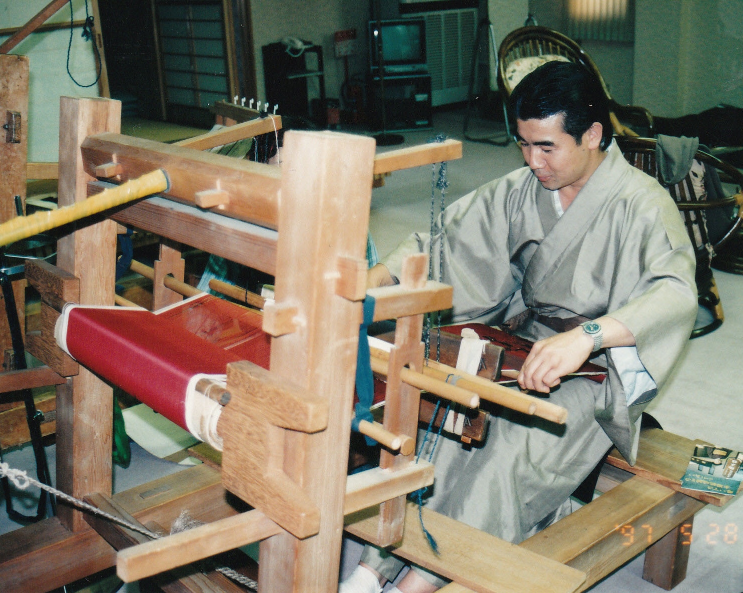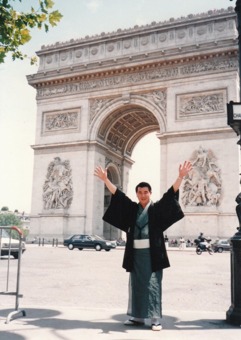 修業を終え24歳で家業を継ぎ27歳で結婚、一男一女に恵まれました。ネクタイ大好きでしたが、仕事中はなるべく「作務衣」を着ていました。そして展示会の時には着物姿でしたが、どうせ仕事をするなら着物と生涯を共にしようと考え、32歳の時フランスのパリで「きもの宣言」をしました。