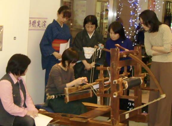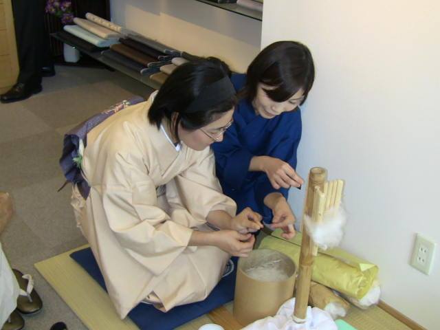 そのような経験を重ねながら、本当に価値のある着物の良さを分かってもらいたいと思い、熊本市内(熊本電気ビル・熊本ホテルキャッスル横)に「きものサロン和の國」をオープンしました。数年前は、室町の加納織物さんのご縁で、縞屋の宮崎織物(茨城県・結城市)さんにお越しいただき、ご来店の皆さまに「糸とり」や「機織り」の体験を通して匠の技の片りんに触れて頂きました。