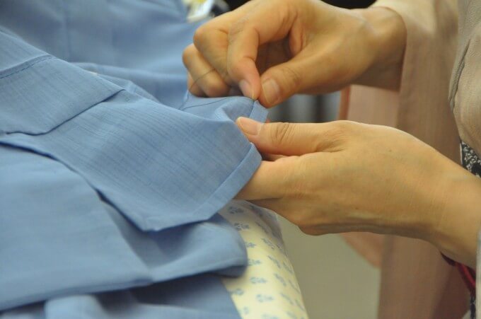 ドアの取っ手に、袖口が引っかかったりしたことはありませんか?僕はその常習犯ですが、「小さなほころびでもそのままにしておかない」をモットーにしています。裾(すそ)周りや袖付け付近、単衣(ひとえ)の縫い代(ぬいしろ)部分、居敷当(いしきあて)などのあらゆるほころびを縫い直しいたします。お気軽に申し付けください。