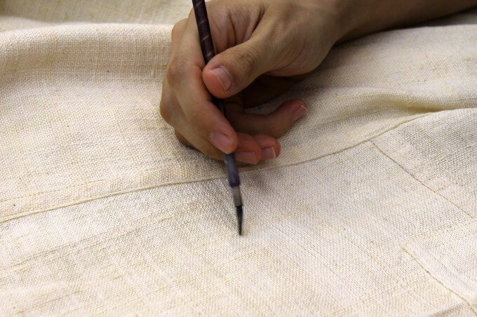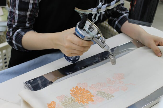 衿についたファンデーションや、上前(うわまえ)・袖(そで)などに付いたシミだけを抜く作業です。ご依頼のシミの箇所のみならず、着物全体を広げて検品し、汚れがつきやすい右袖口(みぎそでくち)、下前(したまえ)の八掛(はっかけ)なども入念にチェックします。しみ抜き後、アイロンで着物のシワを伸ばし、着物の間に紙を入れながら畳むので、シワになりにくく、次回の着用時も安心です。
