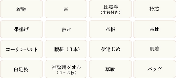 着付け時には下記の品物をご持参下さい。 着付け小物は、和の國でも取り扱っております。